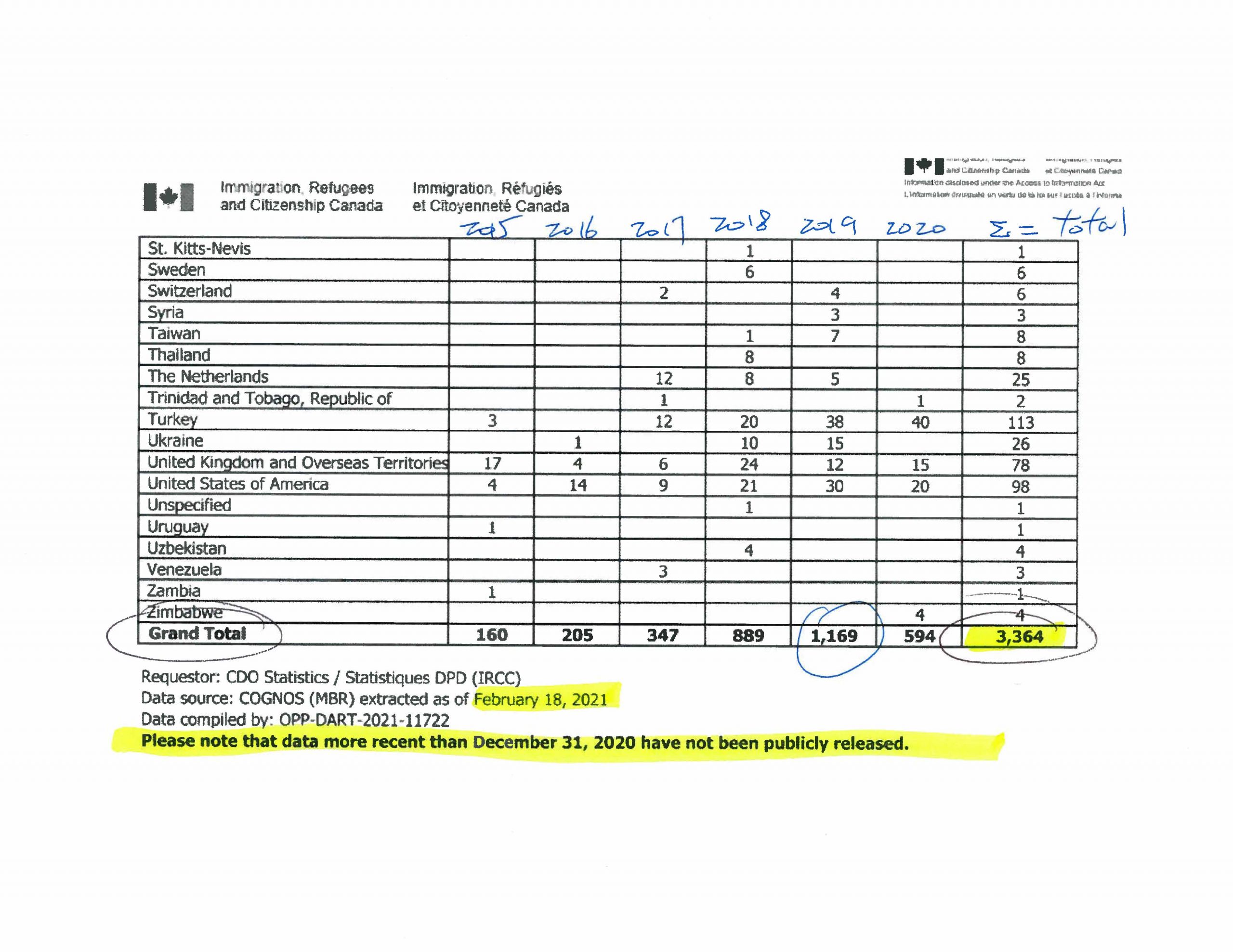 黃先生所屬的專業群組,組員往往分享通過ATIP向移民部拿到的數據,但往往是很宏觀的。自Hong Kong Pathway 於2020.11.12 初露頭角,黃先生自覺有需要跟進其反應,於是自費索取與香港人有關的項目統計數字,之後定期在事務所網站中發放給大家參考,也歡迎大家轉發,當然要提供消息來源,即加拿大黃國為移民法律事務所。
