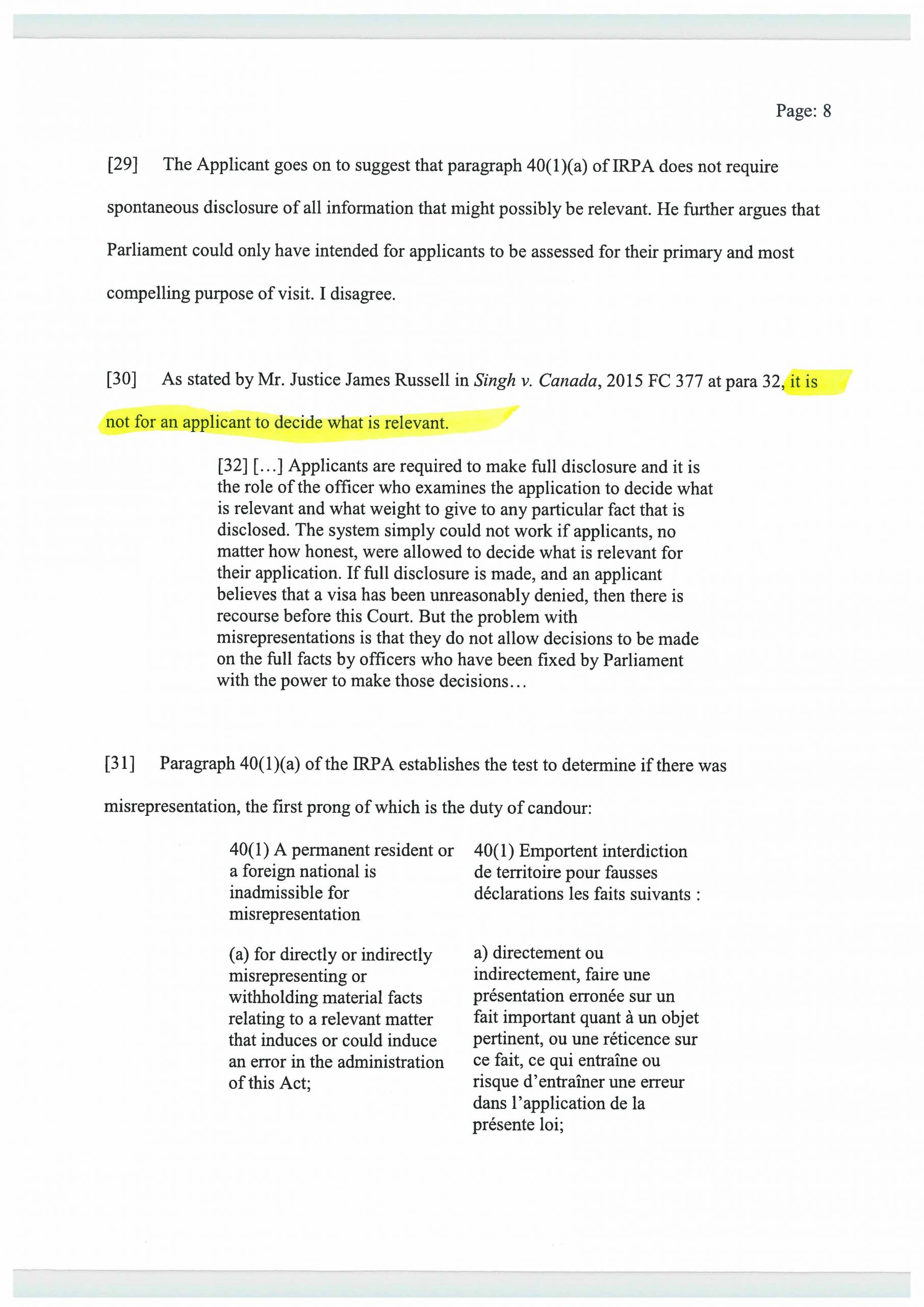 2021.09.16 – 聯邦法院法官支持Immigration Division 裁判官的決定,他完全有機會將找工的事實於2019.02 如實說出,而辯護的理由不能成立,因為責任在於申請人忠實,沒有權自我判斷什麼事告知簽證官什麼可以省卻。另外,就算有聘用 Authorized Representative 處理,也不能以不懂英文推卸責任,因為最終自己要簽名的。移民部代表律師甚至提出申請人最初於 2017.12.15 申請第一次旅遊簽證時沒有交代燒焊工的海外工作背景,是再度 Misrepresented,但已不再重要。