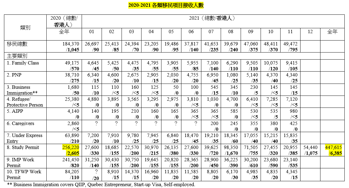 2020-2021各類移民項目接收人數香港人關心的移民部數據 @前言/分析在事務所香港人團隊協助下,我們誠意整合各方面消息來源製作以下圖表,公開香港人有興趣的移民部統計數字,起點是2020全年,之後由2021年開始為每月計算,讓大家看到整個趨勢。我們會定期跟進2022每月的變更,但提醒大家,移民公佈的數據一般是2-3個月延誤的。就以學簽為例,2020因為疫情,全球只簽發256,220,當中包括2,605香港人,當時Hong Kong Pathway仍未揭開序幕。到2021,疫情有所好轉,全球迎來447,615留學生,香港人佔當中的6,385,比2019的2,490及2020的2,605有顯著的大幅增長,很明顯是Hong Kong Pathway吸引到更多香港人走Stream A,這批香港朋友的背景大家心裡有數。起來, 不願做奴隸的人們!